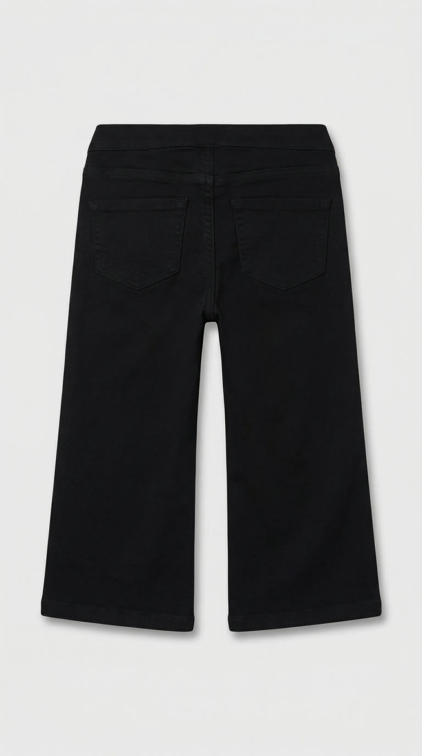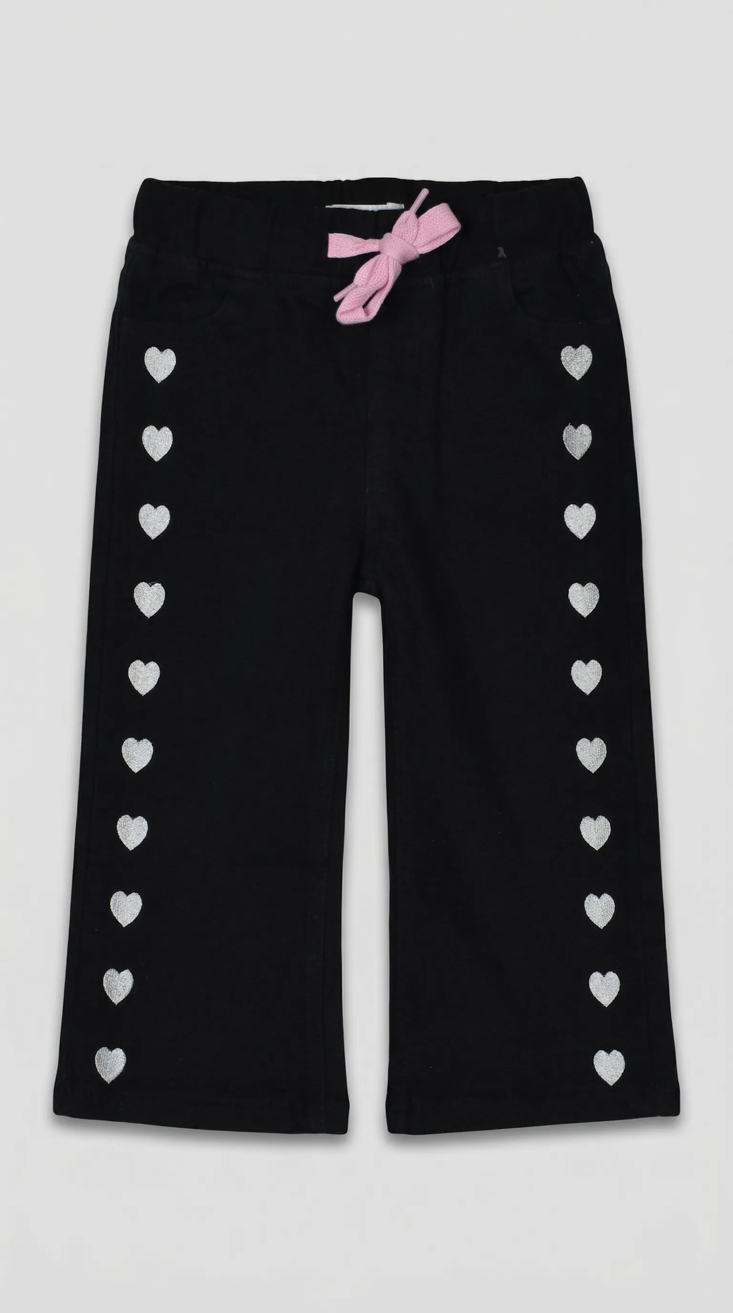 Bold, sparkly, and completely her. The black heart glitter jeans are for the little girl who walks into a room and owns it. Silver hearts, wide leg, and a pink bow that ties the whole look together.