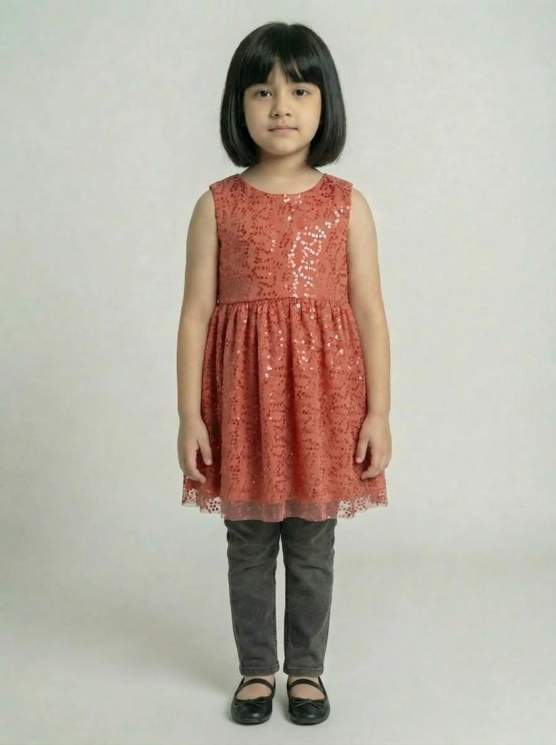 Coral sequin net frock for girls by Level Apparels Pakistan