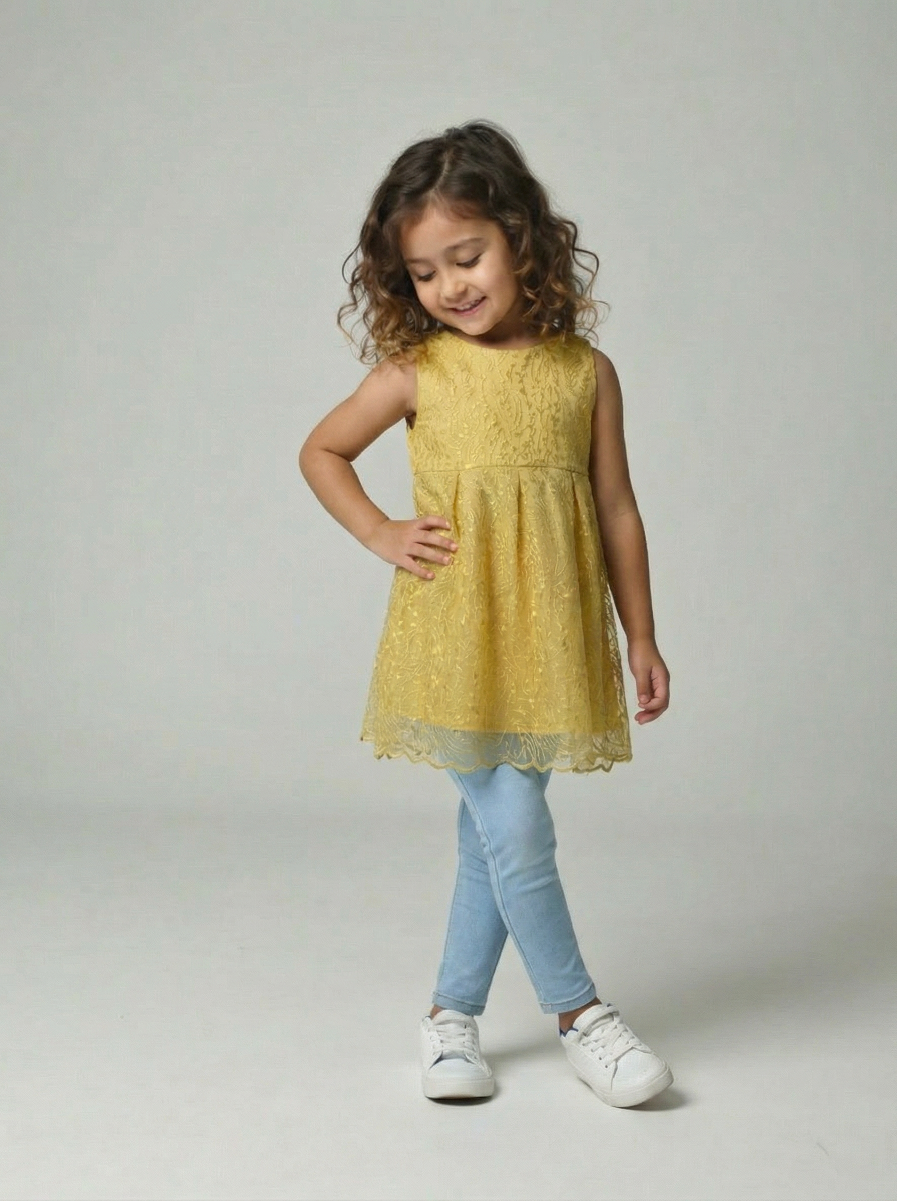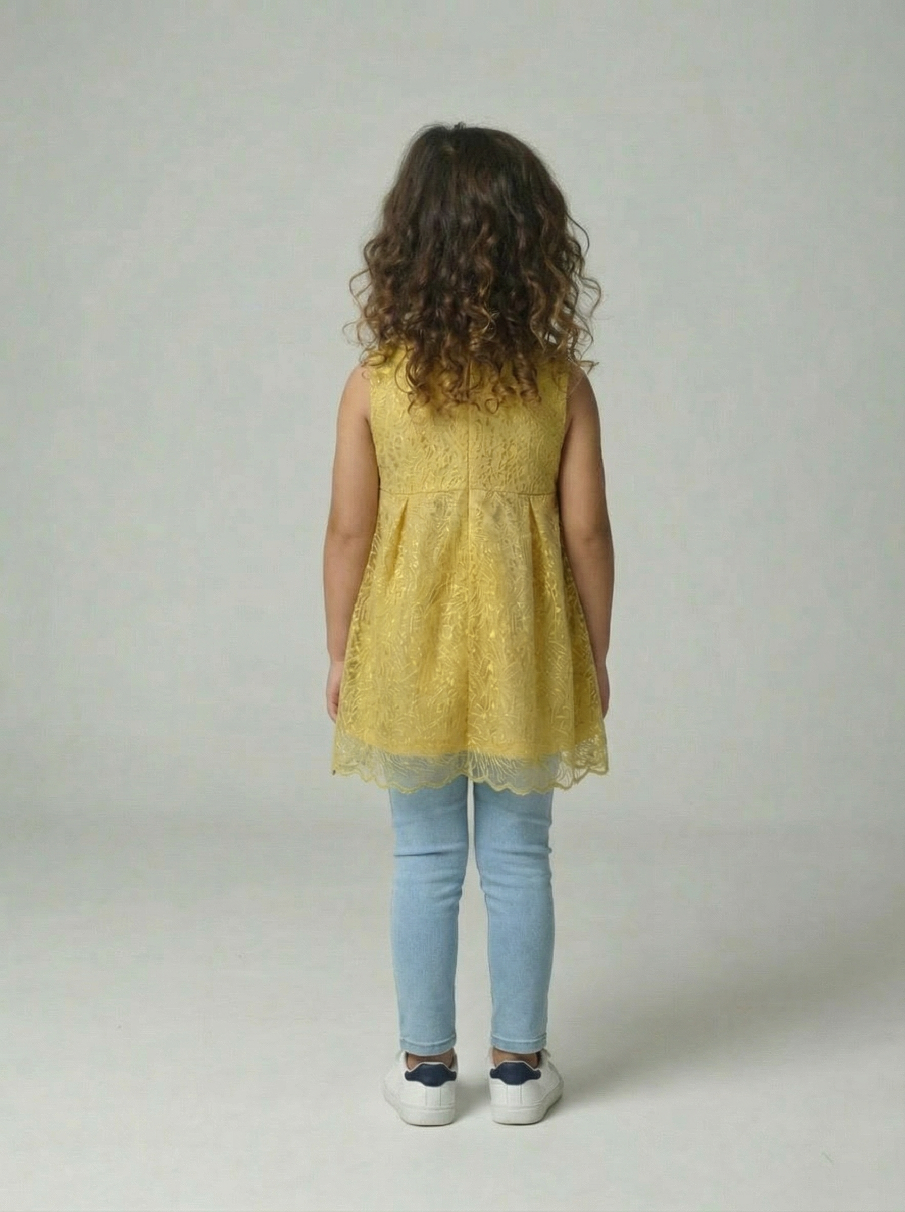 The Golden Lace Net Frock by Level Apparels is crafted from premium net fabric with intricate floral and vine embroidery woven throughout — giving it the richness of a formal outfit with the lightness a child needs to move, play, and enjoy herself freely.